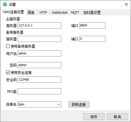 中修改 TARS連線設定的資訊,如果是按照預設設定設定的連線,則可以直接點選[獲取連線]