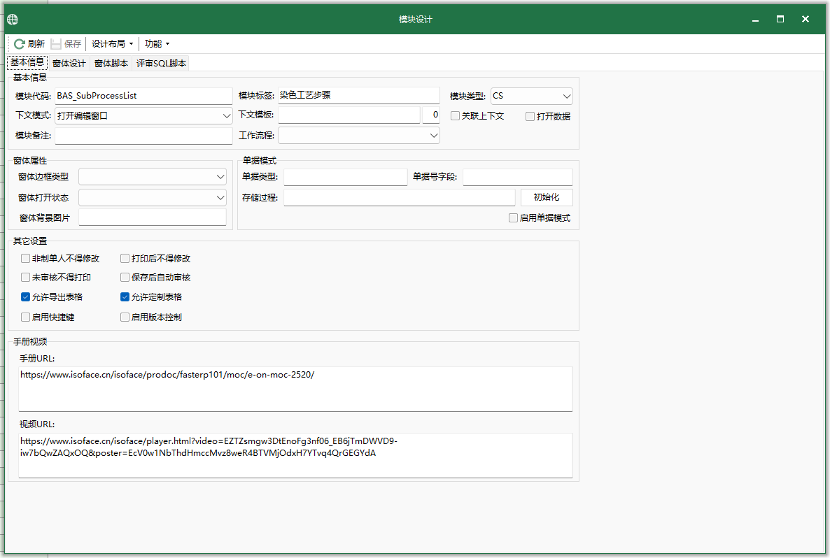 在模組設計列表界面中,點選[編輯]按鈕,會打開編輯界面,在基本資訊頁面中,填寫模組程式碼,模組標籤等基礎資訊,根據需求去設定各選項。