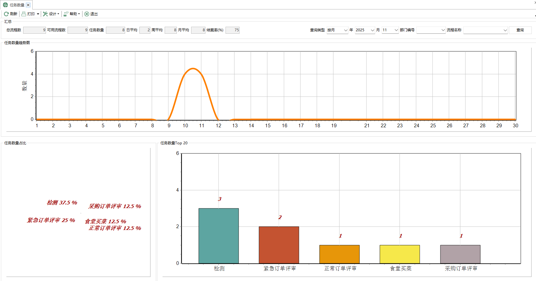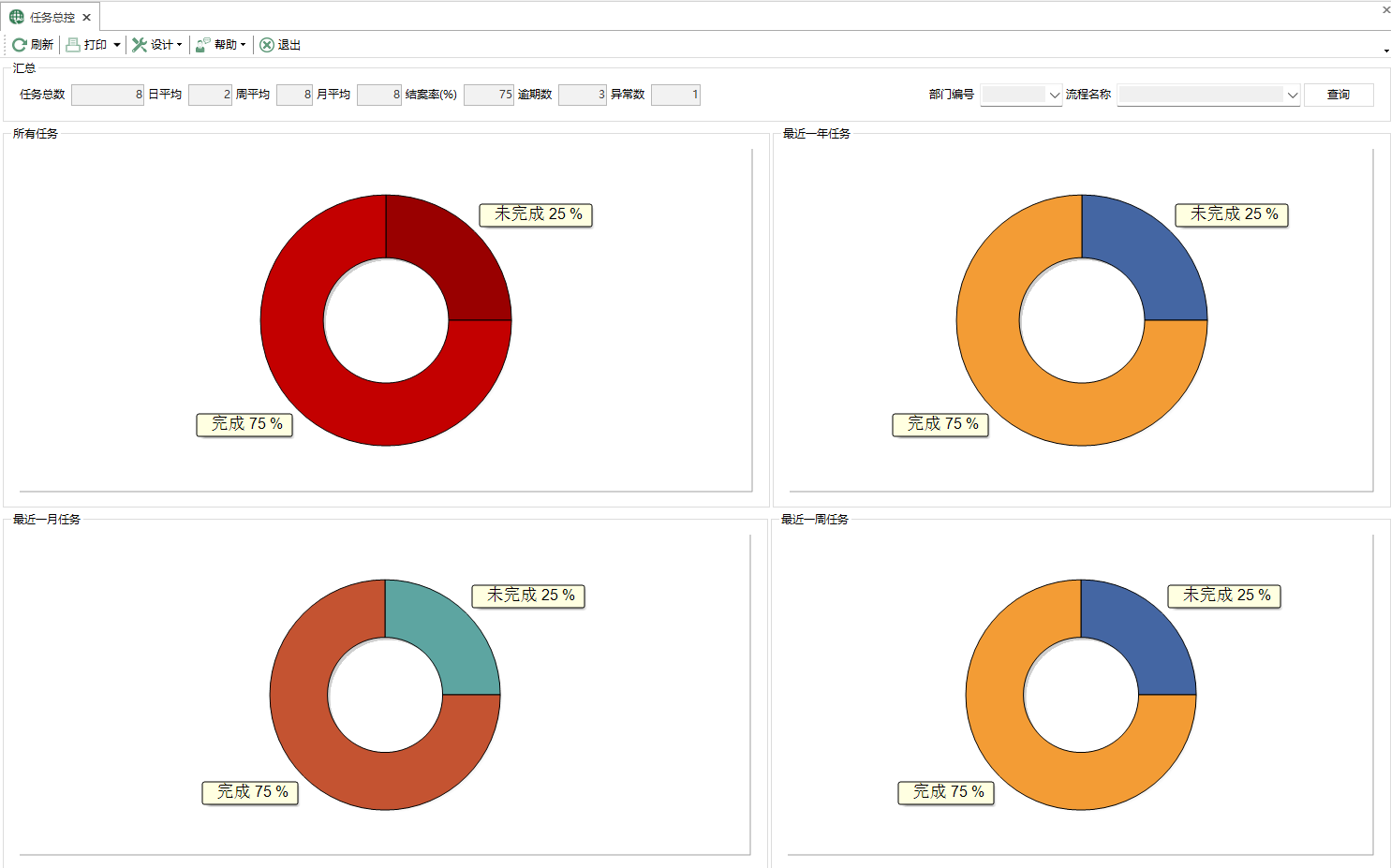 流程總控中顯示工作流程涉及的資訊,以及工作流程的完成率餅圖。 通過工作流程的完成率的統計,瞭解各個工作流程是否存在無法完成的情況。用來輔助以下決策事項: