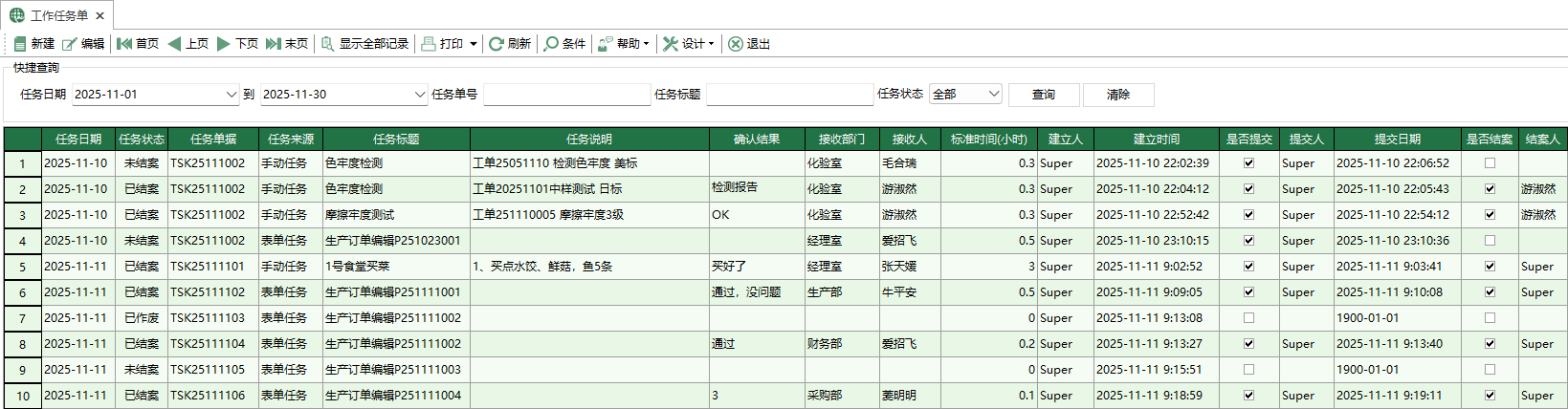 [任務管理]-[工作任務單],打開[工作任務單]界面,界面中可以檢視工作任務單的內容,