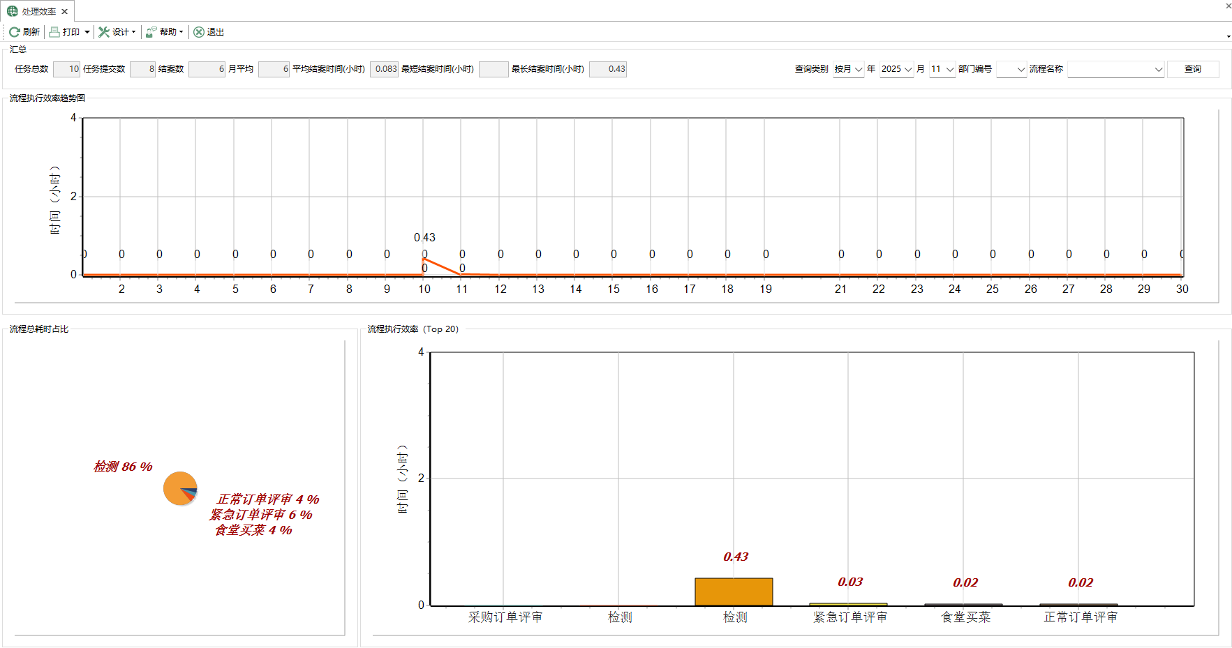 處理效率是一個報表,展示工作流程處理所需時間相關的數據,包含趨勢圖、佔比圖、執行效率的排序圖等。展示每個流程從開始到完成所耗費的時間,這類數據對企業運營管理具有非常重要的價值。它可以幫助公司做出以下決策: