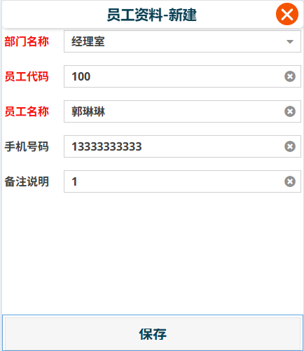 [新建]按鈕,打開員工資料編輯框,選擇員工所在的部門,填寫員工程式碼/員工名稱/手機號碼等資訊。點選[儲存]按鈕。