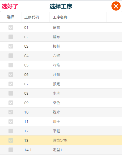 [選擇工序]按鈕,打開工序選擇對話方塊,依次選擇使用的工序,選擇完畢后,點選選好了返回到開卡編輯畫面。