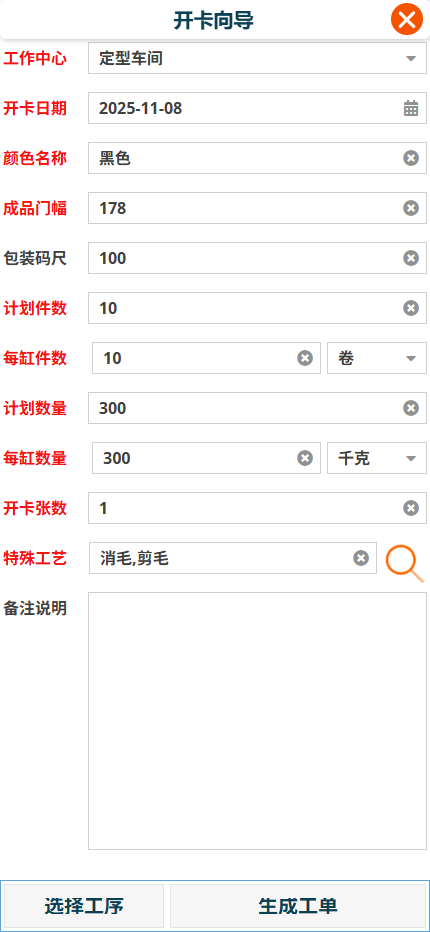 工作中心/開卡日期,依次輸入開卡需求(顏色名稱/成品門幅/包裝碼尺/計劃件數/每缸件數/計劃數量/每缸數量/開卡張數),在特殊工藝欄位右側點選按鈕,選擇要匯入的特殊工藝名稱。