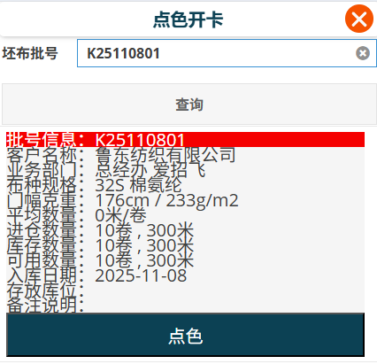 [點色開卡],打開點色開卡畫面,該步驟參考的是開卡嚮導中的按庫存批次開卡的模式。其它的模式不適用。輸入要點色開卡的批號,點選[查詢]按鈕。在查詢的結果中找到要開卡的批號,點選對應行的[點色]按鈕。