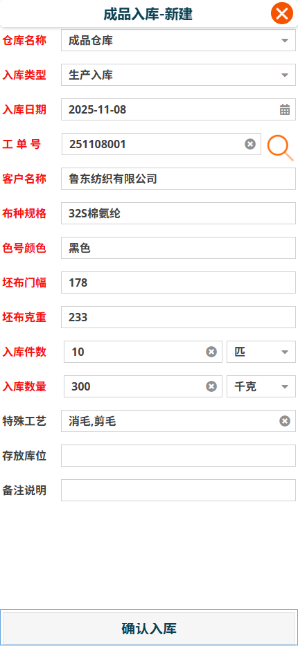 - 坯布生產入庫記錄的查詢、新增等操作。