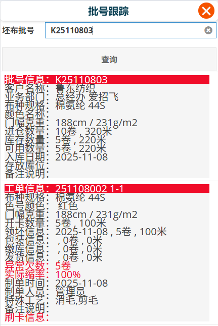 點選[批號跟蹤],打開批號跟蹤畫面,輸入要查詢的坯布批號,批號資訊與對應的工單資訊。