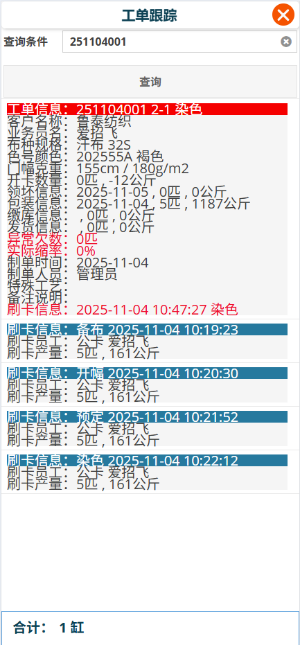 點選[工單跟蹤],打開工單跟蹤畫面,輸入要查詢的坯布批號或者工單號,顯示對應的工單資訊。