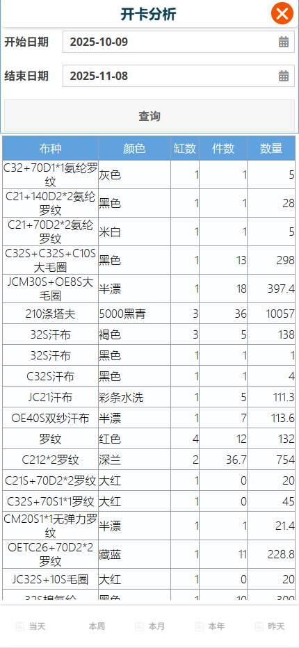 點選[報表中心]-[開卡分析],打開開卡分析畫面,選擇要查詢的時間範圍。點選[查詢]按鈕,展示顯示按布種、顏色彙總的數量。