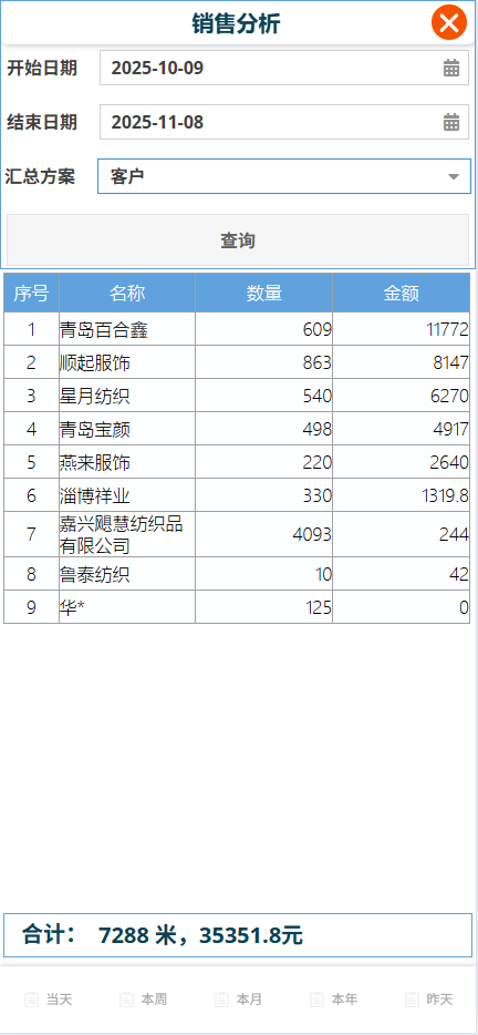 點選[報表中心]-[銷售分析],打開銷售分析畫面,選擇要查詢的時間範圍、彙總方案。點選[查詢]按鈕,展示按選擇的彙總方案彙總的數量資訊。