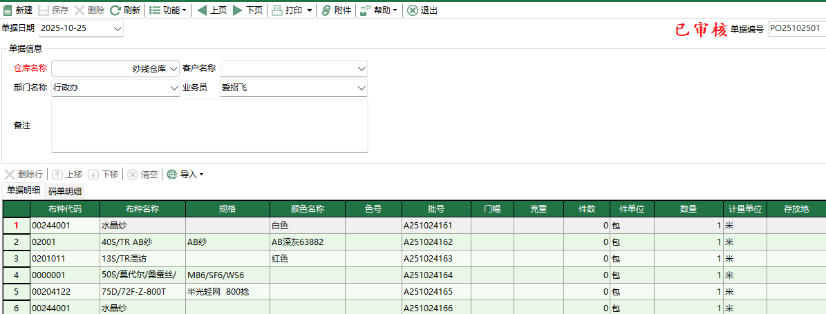 [批號]: 坯布入庫時由系統產生的一串編號,通過該編號可以用於記錄追蹤入庫的坯布的業務流向。
